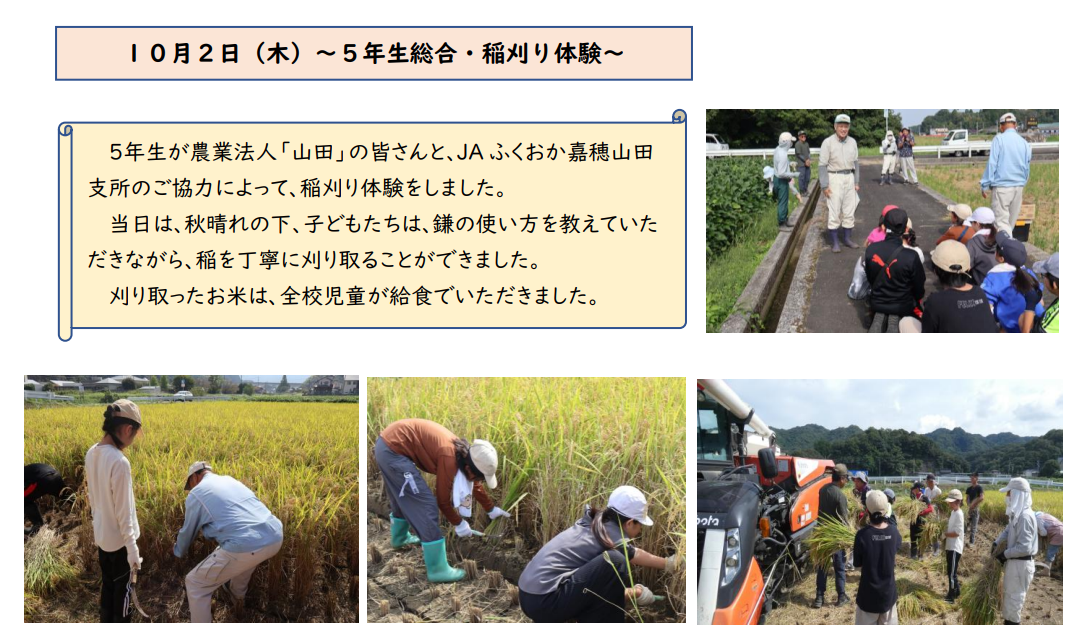 下小スポーツフェスティバルが終わり、通常の学校生活が戻ってきました。そんな朝、一年生が校長室にお花を届けてくれました。小さな手で思いを込めて活けてくれたのだと思います。心温まる瞬間でした。また、今日は5年生が稲刈りを行いました。地域の方や農協の方々にお世話いただき、貴重な体験をさせていただきました。今週末には、下小クリーンアップ活動を予定しています。こちらでも地域の皆様のご協力をお願いいたします。
