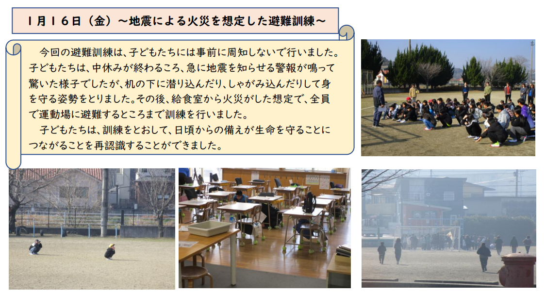 今日は、地震と火災の避難訓練を行いました。子どもたちは、Jアラートの音が流れると机の下に身を隠し、火災報知機の音を聞くと、静かに運動場に避難しました。避難に要した時間は、1分30秒ほどと合格点でした。この機会に各家庭でも、避難場所等の確認をしてみてはいかがでしょうか。