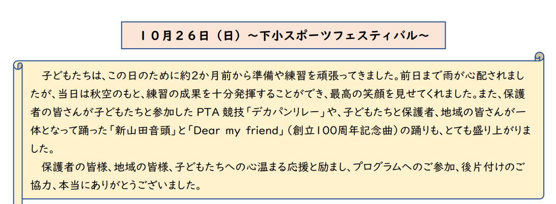 本日、学級紹介を更新しています。下小スポーツフェスティバルの様子を紹介しています。ご覧ください。