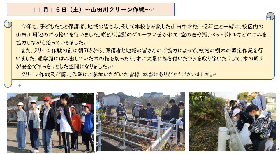 今日は、下小クリーンアップ活動についてお伝えします。校区の清掃活動を通して、地域を大切にしていこうという心情を育てる目的で行いました。地域や保護者、公民館の関係者の方々が45人ほど集まった今回の活動。下山田を思う気持ちが詰まった心温まるものとなりました。終了後には、PTAのフラワーアレンジメントの研修も行います。この様子は、後日お伝えします。