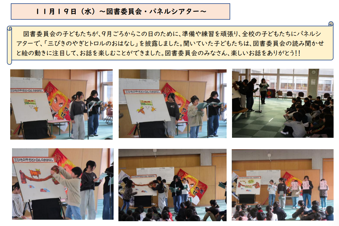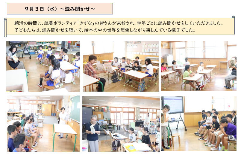今日は、朝の読み聞かせを行いました。いつもとは違った他の学年の先生が読み聞かせに来てくれるということで、子ども達は始まる前からワクワクしているようでした。来週からは、「秋の読書祭まつり」が始まります。たくさんの本と出会ってほしいと思います。