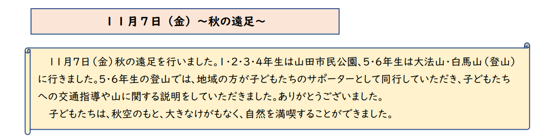 先週の金曜日、晴天の下、秋の遠足を実施しました。詳しくは、学級紹介をご覧ください。お弁当の準備などご協力ありがとうございました。