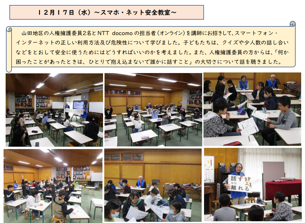 今日は、「SNSのトラブルとコミュニケーション」と題し、5・6年生を対象として保護者と学ぶ規範意識事業を実施しました。講師は、福岡県立大学の原田准教授でした。子ども達にもわかりやすく、事例を交えながら、お話をしていただきました。年々、SNSにおけるトラブルが多くなっています。夏休みを控えたこの時期、ご家庭でも、SNS等の利用の仕方について、もう一度お話をされてみてください。