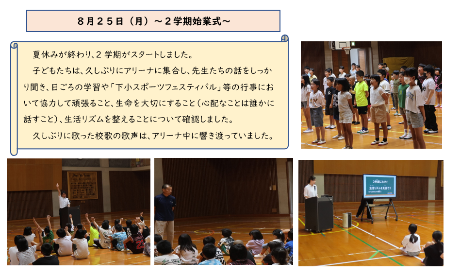 早いもので9月も中旬を迎えました。学校では明日から正式に下小スポーツフェスタの練習が始まります。運動場には入退場門もたち、準備万端です。応援旗もあと少しで完成です。力を合わせ、実りの多いスポーツフェスタにしていってほしいと思います。