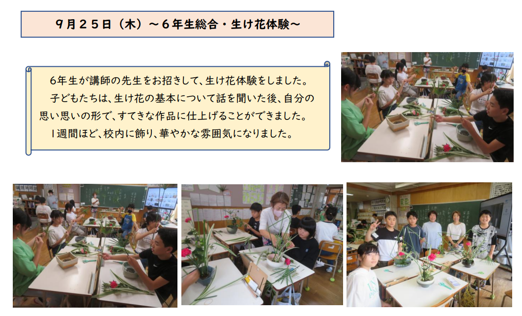 昨日、6年生が室町文化体験として水墨画と生け花にチャレンジしました。ほとんどの子が初体験ということで、少し緊張気味でした。しかし慣れてくると、思いっきりのよい作品や繊細な作品を仕上げていました。学級紹介にも様子を載せていますのでそちらもお楽しみください。