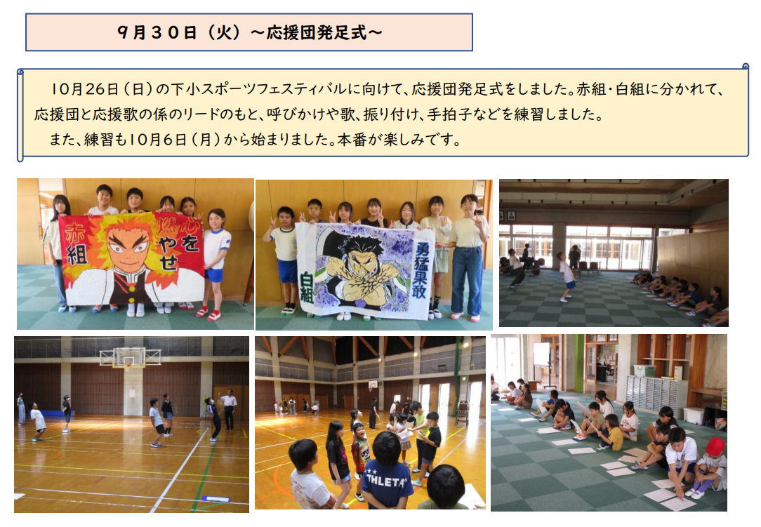 今週は下小スポーツフェスティバルにむけた応援団発足式が行われました。応援旗も完成し、毎日、応援の声が校舎の内外に響いています。当日が楽しみです。